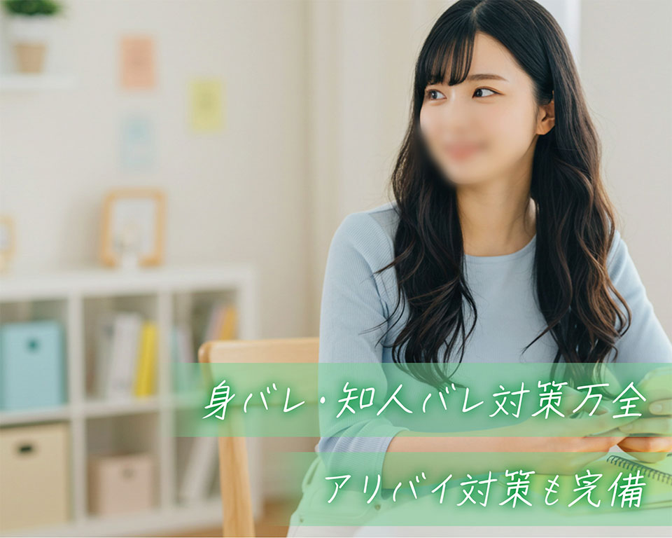 当店は身バレ・知人バレ対策を万全に行っていますのでご安心ください。女の子のご希望に合わせてパネルを作成し、顔出しNGはもちろん、目元だけ、口元だけ、ぼかしなど柔軟に対応します。アリバイ対策も完備していますので、あなたのプライバシーを守りながら、安心して働くことができます。
